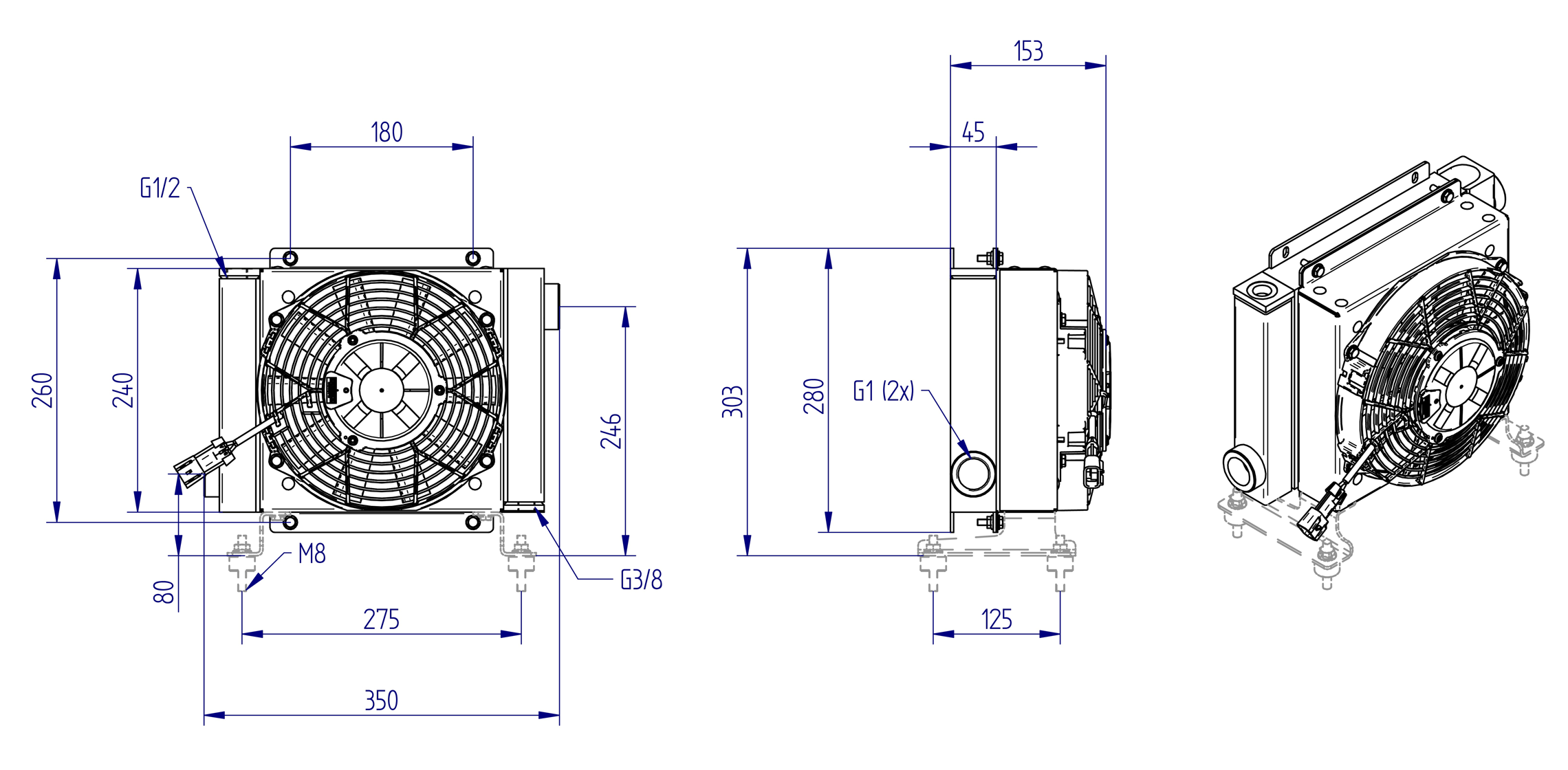 | Item | Oil flow | Capacity | Weight | Voltage | Frequency | Current absorption | Power | Ø Fan | Air flow | Noise level | Rpm |
